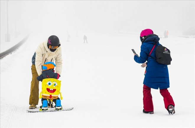 在新疆白云國(guó)際滑雪場(chǎng),許秀娟(右)在給愛(ài)人和兒子拍照。哈爾濱人許秀娟曾是專業(yè)運(yùn)動(dòng)員,代表國(guó)家隊(duì)拿過(guò)國(guó)際大賽獎(jiǎng)牌。退役后她來(lái)到新疆,在這里她和愛(ài)人相識(shí),一起開(kāi)辦培訓(xùn)機(jī)構(gòu),面向青少年推廣冰雪運(yùn)動(dòng)。