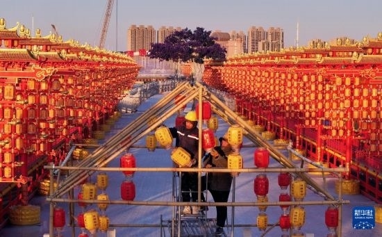 1月23日,工人在河北省唐山市豐南區(qū)河頭老街景區(qū)掛燈籠(無(wú)人機(jī)照片)。