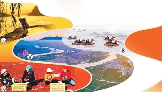 圖④:一名筏工背著羊皮筏子前行。圖⑤:黃河岸邊的龍灣村。圖⑥:游客們?cè)邶垶炒甯浇俗蚱しぷ?。圖⑦:龍灣村村民喜迎紅棗豐收。圖均為宋朝軍、俞寶榮攝影報(bào)道