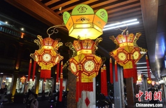 圖為2月20日晚,泉州中山路騎樓兩側(cè),花燈流光溢彩,美不勝收。 中新網(wǎng)記者 張斌 攝