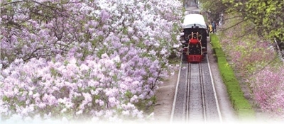 哈爾濱市兒童公園小火車在丁香花海中穿行。張 樹攝(影像中國)