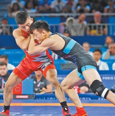 作為2023年摔跤世錦賽該級別銅牌得主,“站上領獎臺”是曹利國在巴黎奧運會的目標。雖然他在首場比賽中有些緊張,但還是以6∶2戰(zhàn)勝埃及隊選手穆阿蒙·穆罕默德。在1/4決賽中,他表現(xiàn)得更加自如,以5∶3戰(zhàn)勝委內(nèi)瑞拉隊選手羅德里格斯·奧羅斯科。半決賽曹利國對陣朝鮮隊選手李世雄,他在1∶3落后的情況下,最后時刻憑借邊界一記提抱摔將比分追至3∶3,憑借后得分取勝。