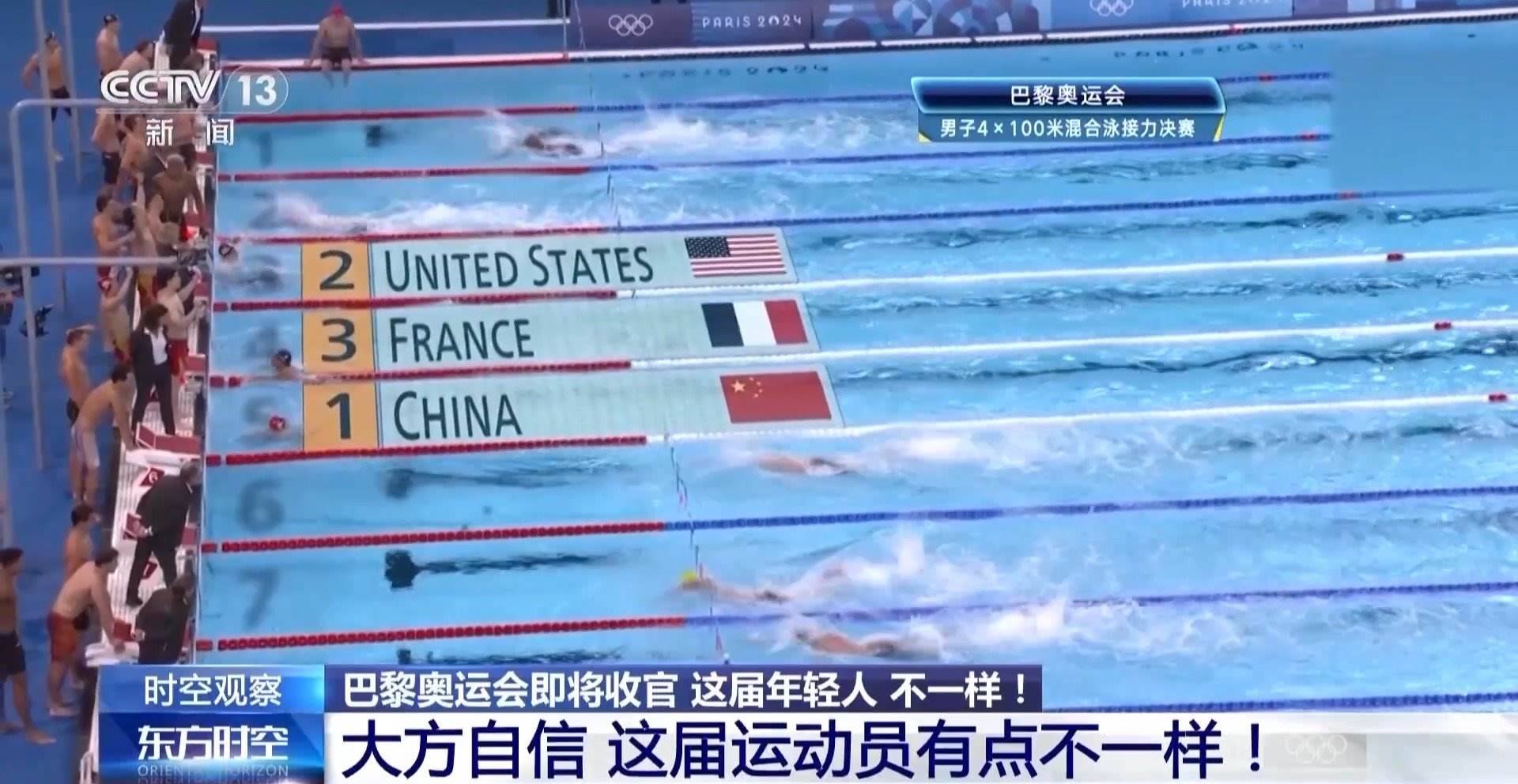 巴黎奧運(yùn)會(huì)游泳賽場(chǎng)最后一個(gè)比賽日,中國(guó)隊(duì)放了個(gè)大招。男子4X100米混合泳接力決賽上,中國(guó)隊(duì)力壓該項(xiàng)目40年“霸主”美國(guó)隊(duì),以3分27秒46的成績(jī)奪冠。