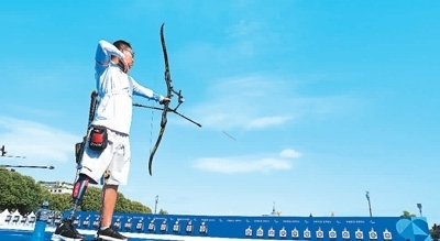 當(dāng)?shù)貢r間8月24日,在法國巴黎榮軍院旁的射箭訓(xùn)練場內(nèi),中國殘奧射箭隊在進行適應(yīng)性訓(xùn)練。拉弓、瞄準、松弦,中國隊選手甘俊射出正中靶心的一箭后,臉上露出笑容。他表示:“風(fēng)速、風(fēng)向?qū)穆潼c影響較大,我會盡快適應(yīng),調(diào)整到最佳狀態(tài)。”甘俊對自己參加的首屆殘奧會充滿期待。
