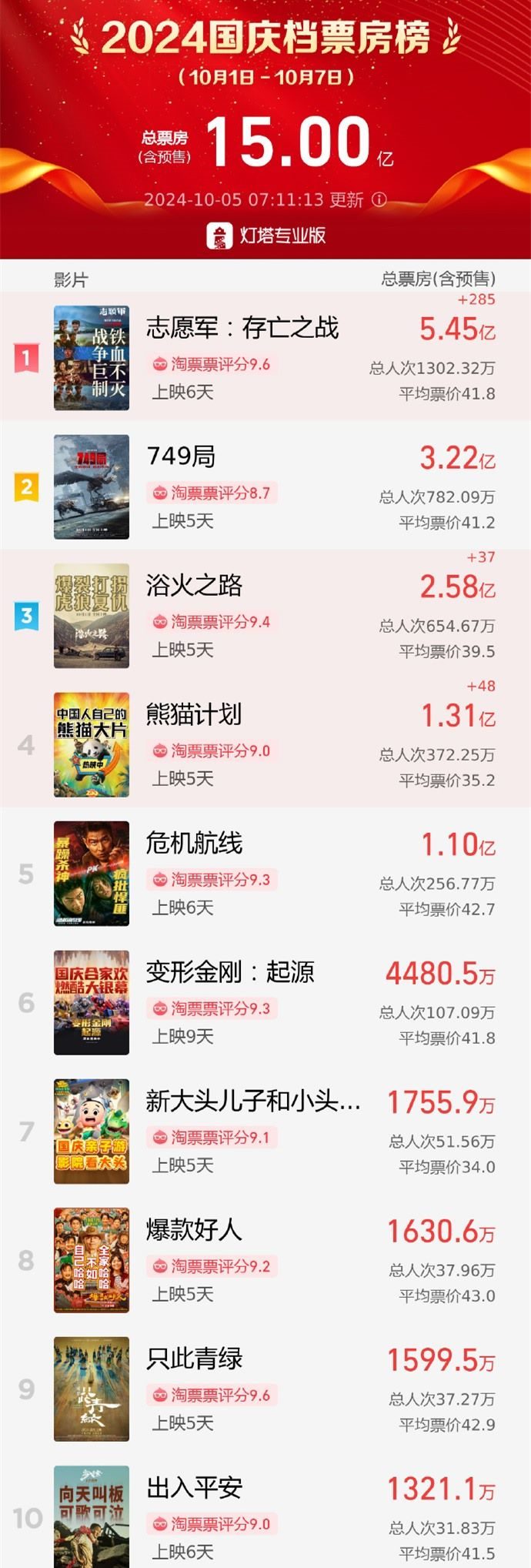 央視網(wǎng)消息:據(jù)網(wǎng)絡平臺數(shù)據(jù),截至10月5日7時11分,2024年國慶檔(10月1日—10月7日)檔期內(nèi)總票房(含預售)突破15億。