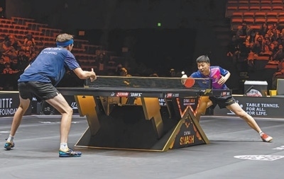 WTT中國大滿貫賽,中國選手馬龍(右)在比賽中。本報記者 張武軍攝