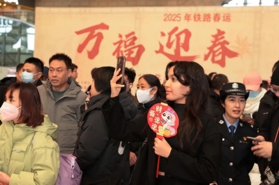 2025年鐵路春運(yùn)“萬(wàn)福迎春”活動(dòng)現(xiàn)場(chǎng),一位外籍旅客自拍留念。