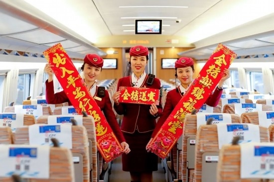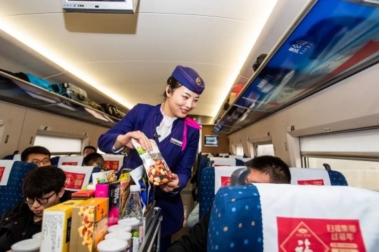 除夕當(dāng)天,復(fù)興號(hào)上的乘務(wù)員送出祝福。