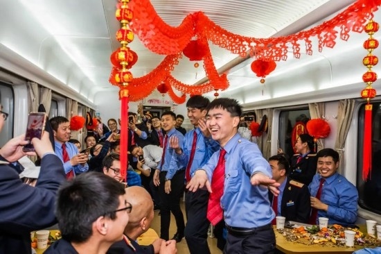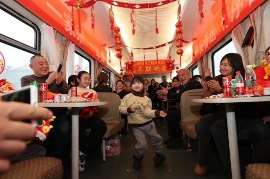 2月4日,臨客列車上的客運(yùn)員與旅客一起聯(lián)歡。