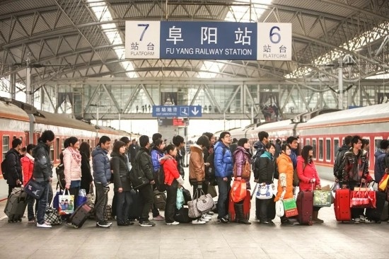 元宵節(jié)剛過(guò),返程旅客在阜陽(yáng)站排隊(duì)等候上車。