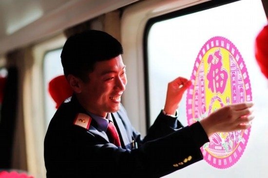 大年三十,成都至北京西的臨客列車上,一位列車員正在貼窗花。