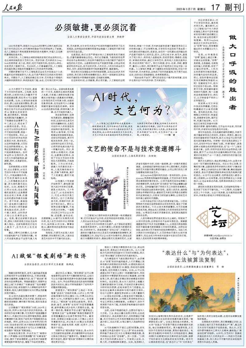 人工智能(AI)是科學(xué)技術(shù)發(fā)展到新一輪的最新變革,它不僅推動(dòng)產(chǎn)業(yè)升級(jí),改變傳統(tǒng)經(jīng)濟(jì)的面貌,而且對(duì)人類(lèi)社會(huì)生活產(chǎn)生深遠(yuǎn)影響,也必將深刻地改變文藝和文學(xué)。文藝工作者應(yīng)該具備感知時(shí)代變革的能力,大膽學(xué)習(xí)研究新生事物,讓傳統(tǒng)藝術(shù)的創(chuàng)作插上新的時(shí)代翅膀。2025年全國(guó)兩會(huì)召開(kāi)之際,本版約請(qǐng)全國(guó)人大代表、全國(guó)政協(xié)委員共同探討“AI時(shí)代,文藝何為?”這一話題,以饗讀者。
