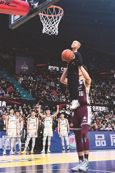 本屆全明星賽第二節(jié)最后的一次暫停時,現(xiàn)場上演了溫情一幕:北區(qū)明星隊首發(fā)中鋒楊瀚森,舉起來自吉林省孤兒學校的小朋友趙路健,幫助他完成了一次扣籃。