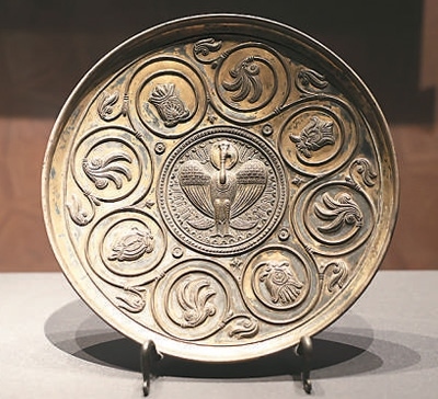獅子在伊朗文化中有著獨特的含義,被視作密特拉的化身。在瑣羅亞斯德教成為正統(tǒng)后,獅子進一步成為波斯帝王權(quán)力的象征。展出文物中常見獅子形象,如阿契美尼德王朝的大理石獅子首、青銅獅形御座腿,薩珊王朝(公元3—7世紀)的嵌金獅紋銀盤、青金石人首獅首紋黃金項圈等。嵌金獅紋銀盤采用了薩珊金銀器常用的火法鍍金工藝,盤中央的大圓形框內(nèi)為獅子圖案,周圍6個小圓形框內(nèi)飾有幾種動物圖案,包括鹿與公羊等。黃金項圈上裝飾著3顆碩大的青金石,左右兩顆為圓形,飾有獅頭,中間的一顆為橢圓形,雕刻著人物頭像,專家推測為薩珊國王的形象。