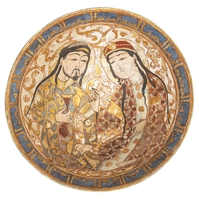 米納伊彩人物花卉銘文釉陶碗為核心展品之一。它產(chǎn)于公元12—13世紀,內(nèi)壁中央繪有一對戀人,這是古代伊朗常見的藝術(shù)插圖題材。這對戀人的形象具有明顯的東亞人特征,男子手中握著一個精致的酒杯,似乎在向他的愛人敬酒。人物周圍環(huán)繞著平行和扭曲的阿拉伯式花紋,碗口在一圈鈷藍底上飾有金色庫法體文字。
