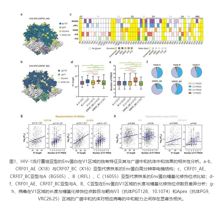 研究團隊首先利用單分子冷凍電鏡技術與生物大分子質譜全面揭示了CRF01_AE和CRF07_BC代表型株系的Env蛋白結構與糖基化修飾(圖1a-c)。隨后從上述研究中獲得的線索出發(fā),對當前數(shù)據(jù)庫中六千余條不同亞型的Env蛋白的V1區(qū)域進行了跨亞型對比和分析。結果顯示,相比于其他亞型,CRF01_AE亞型的V1區(qū)域長度顯著增長(圖1d),且糖基化修飾位點數(shù)目顯著增多(圖1e-f)。進一步對中和實驗數(shù)據(jù)和V1區(qū)域特征的關聯(lián)分析則顯示CRF01_AE亞型在V1區(qū)域的上述特征會明顯削弱兩類廣譜中和抗體(分別靶向Env蛋白的apex與V3區(qū)域)對CRF01_AE亞型的中和效果(圖1g-h)。上述研究結果提示,應盡量避免在CRF01_AE亞型的流行區(qū)域開展靶向Apex或V3區(qū)域的免疫聚焦型疫苗或廣譜中和抗體的臨床試驗。