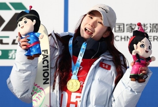 劉夢婷的雪板上有一個“谷”字,她解釋說這是谷愛凌同款定制雪板?!拔液芟矚g她的風(fēng)格,把她作為我的榜樣,激勵我進步?!?/p>