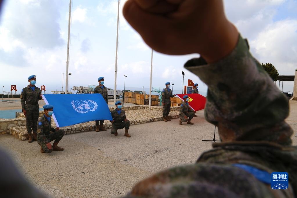 5月1日,在黎巴嫩南部提爾市沙馬村的中國維和營區(qū),中國第20批赴黎巴嫩維和建筑工兵分隊的官兵們面向黨旗和聯(lián)合國旗重溫維和誓詞。新華社發(fā)(莊小好 攝)