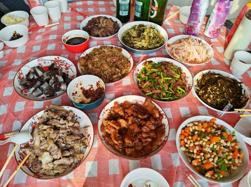 忙活了一上午,紅白相間的桌布上各類菜品早已擺得滿滿當當,除了位居主位的殺豬菜,還多了許多“衍生作品”:醬燜肉、汆白肉、蒜苔炒肉、酸菜炒肉、涼拌豬肝、豬血腸、涼拌海帶條、芥菜絲……圍坐一圈的不止家人,還有左鄰右舍。無需主人過多招呼,筷子便紛紛探向鍋中。窗外寒風(fēng)漸歇,霧氣也被陽光驅(qū)散,而在溫暖的屋子里,鍋氣蒸騰,模糊了窗上的冰花,也潤濕了每一雙帶著笑意的眼睛。這不僅僅是一頓飯,更是鄉(xiāng)里鄉(xiāng)親們對生活最熱烈的擁抱?! ?/p>