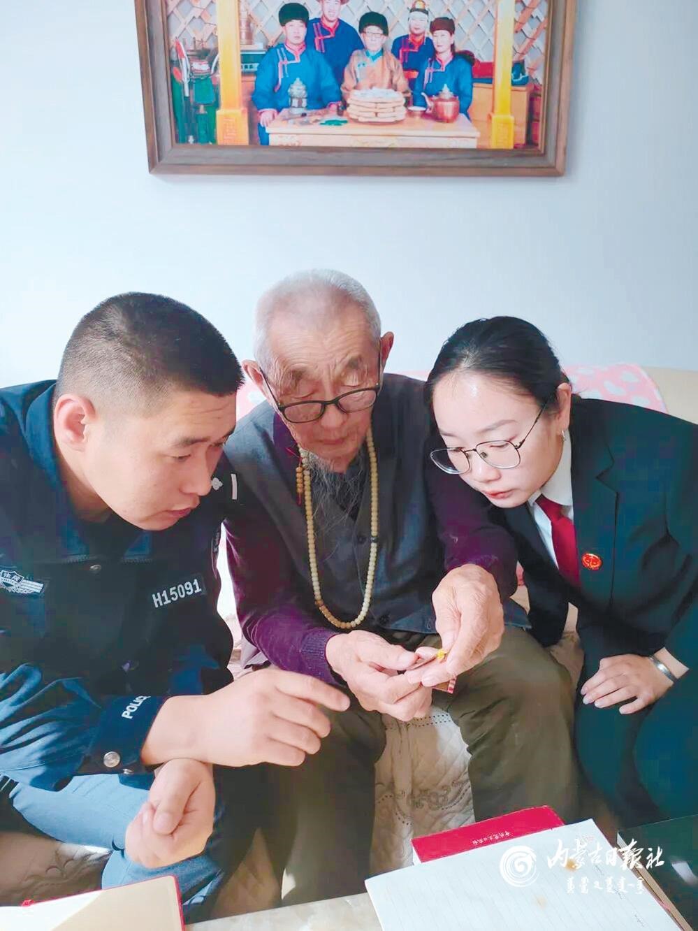 老黨員為青年干警介紹自己獲得的勛章。近日,錫林郭勒盟蘇尼特左旗人民法院組織青年干警來(lái)到91歲的老黨員阿日德那巴吉爾家中,聆聽老人講述黨史故事,接受革命傳統(tǒng)教育。(內(nèi)蒙古日?qǐng)?bào)記者 李晗 攝)