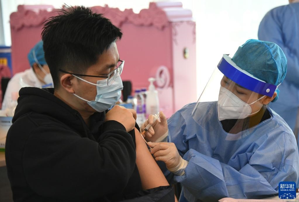 2021年12月7日,北京市海淀區(qū)上地街道組織醫(yī)護人員來到海國瑞業(yè)科技園,為園區(qū)內(nèi)的企業(yè)員工進行新冠疫苗加強針接種。新華社記者 任超 攝