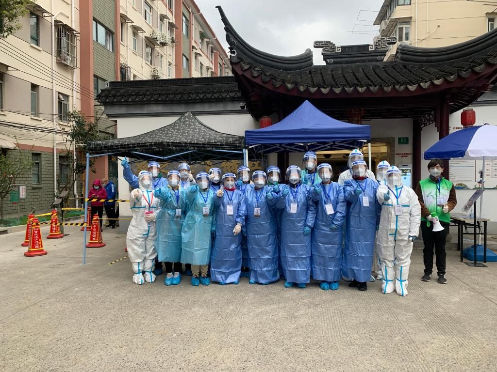 虹儲(chǔ)居民區(qū)核酸檢測(cè)采樣點(diǎn),黨員干部、醫(yī)務(wù)工作者以及來(lái)自各行各業(yè)的志愿者共同抗疫。受訪單位供圖